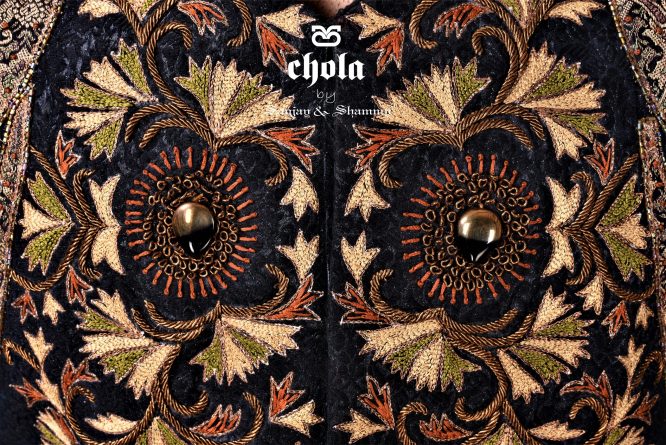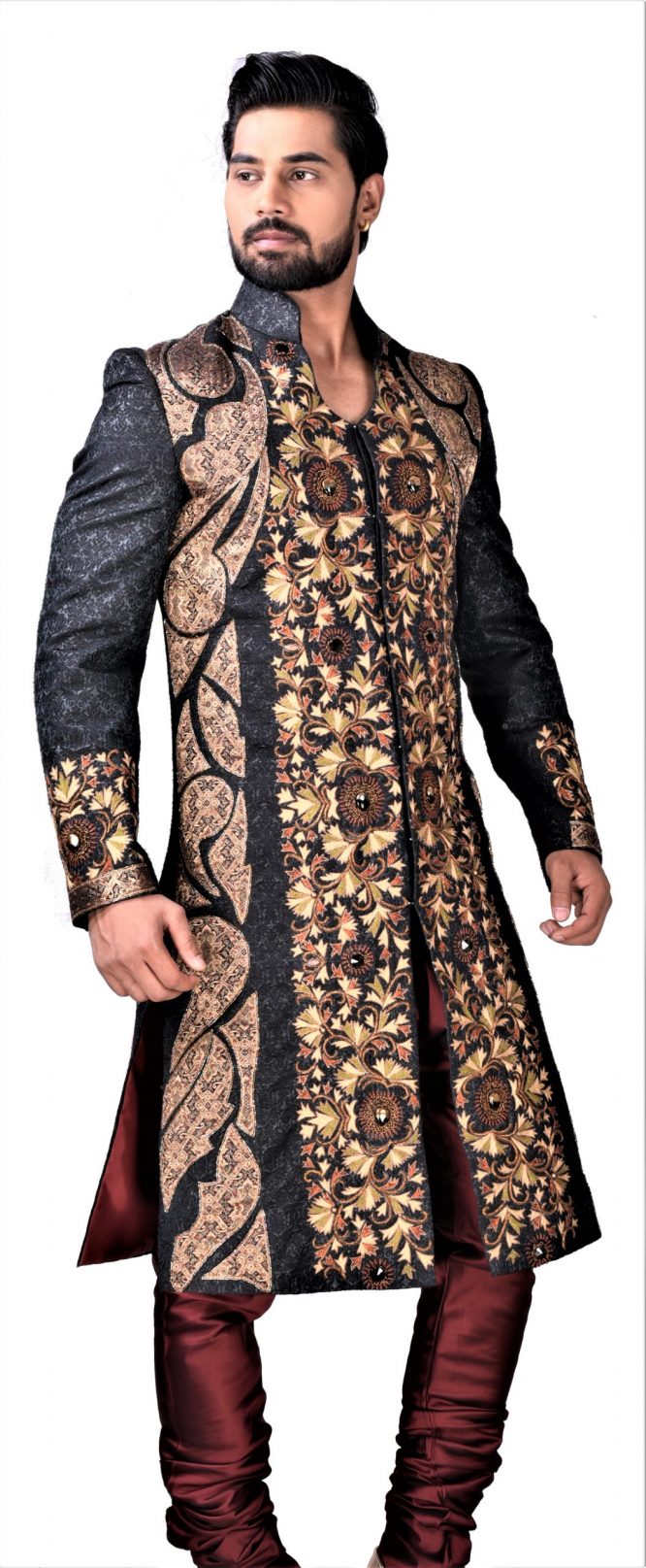 Featuring a silk brocade sherwani in a classic design, hand embroidered with intricate details in front and back.