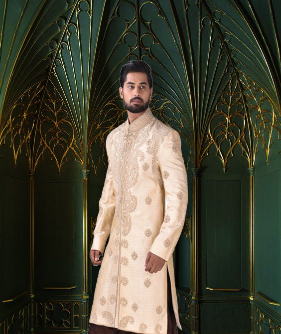 Featuring a brocade silk sherwani in a classic design, hand embroidered on the neck and front.